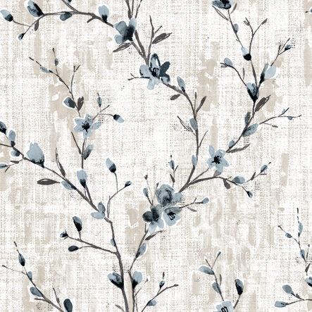 Blomstergren med blå blosmter på beige bund.