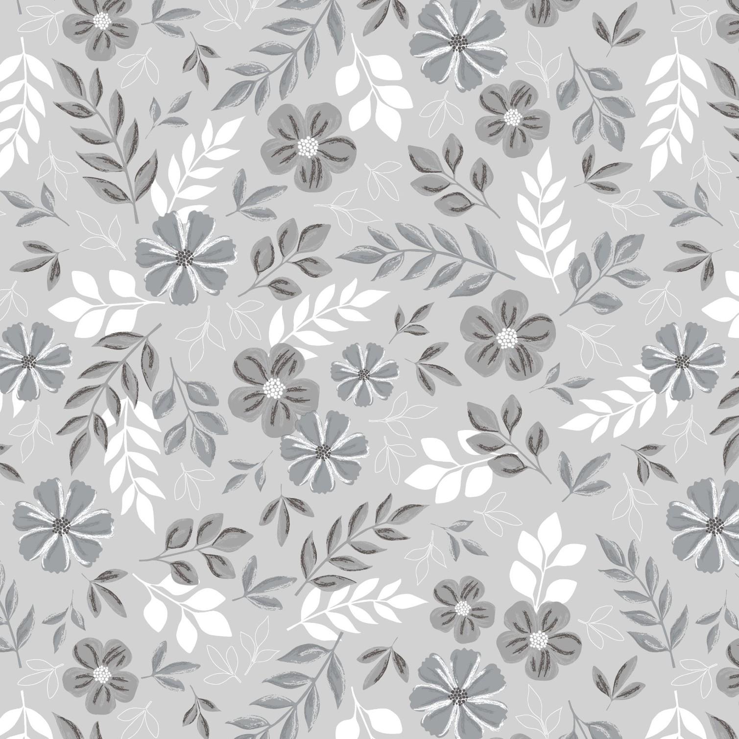 Grå blomster og blade i grå og hvide nuancer på en grå bund